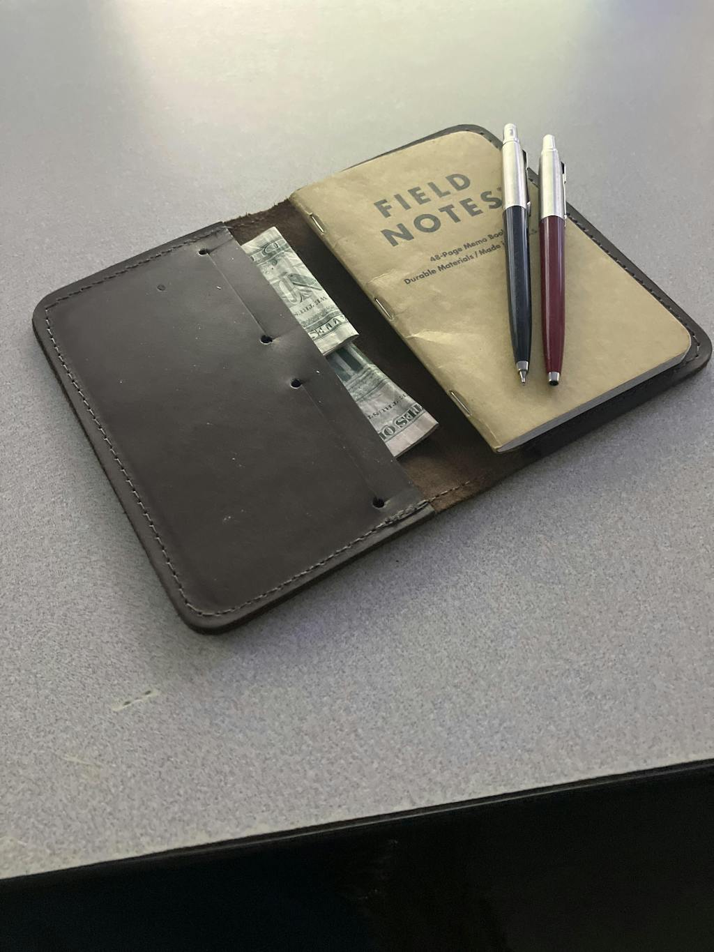 Excellent product. The leather is awesome and quite thick. Meaning it will break in over time without wearing out. Paired with a Field Notes notebook is awesome and ensures one always has a piece of paper handy to jot things down.